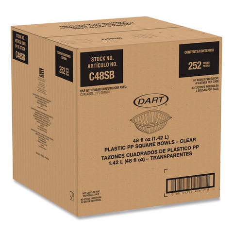 Square Plastic Bowls, 48 oz, 5 x 5 x 2.55, Clear, Plastic, 63 Bowls/Sleeve, 4 Sleeves/Carton