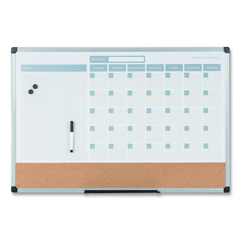 3-in-1 Planner Board, Monthly Planning/Scheduling Calendar, 24" x 18", Tan/White/Blue Surface, Satin Aluminum Frame