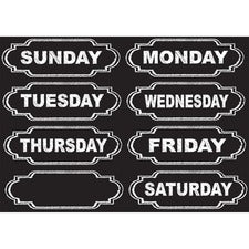 Large Die-Cut Magnetic Chalkboard Days of the Week are great timesavers. Use as headers on your magnetic whiteboards, lockers, refrigerators and other steel surfaces. Write names, goals, assignments, lists and more underneath each day. Bold, white lettering in all caps cannot be ignored. Chalkboard style matches well with coordinating decor. Set includes one blank header so you can handwrite and update with your own idea. Die-cut pieces easily punch out from the 8-1/2" x 11" sheet. Use write-on/wipe-off surface with dry-erase markers or chalk pen.